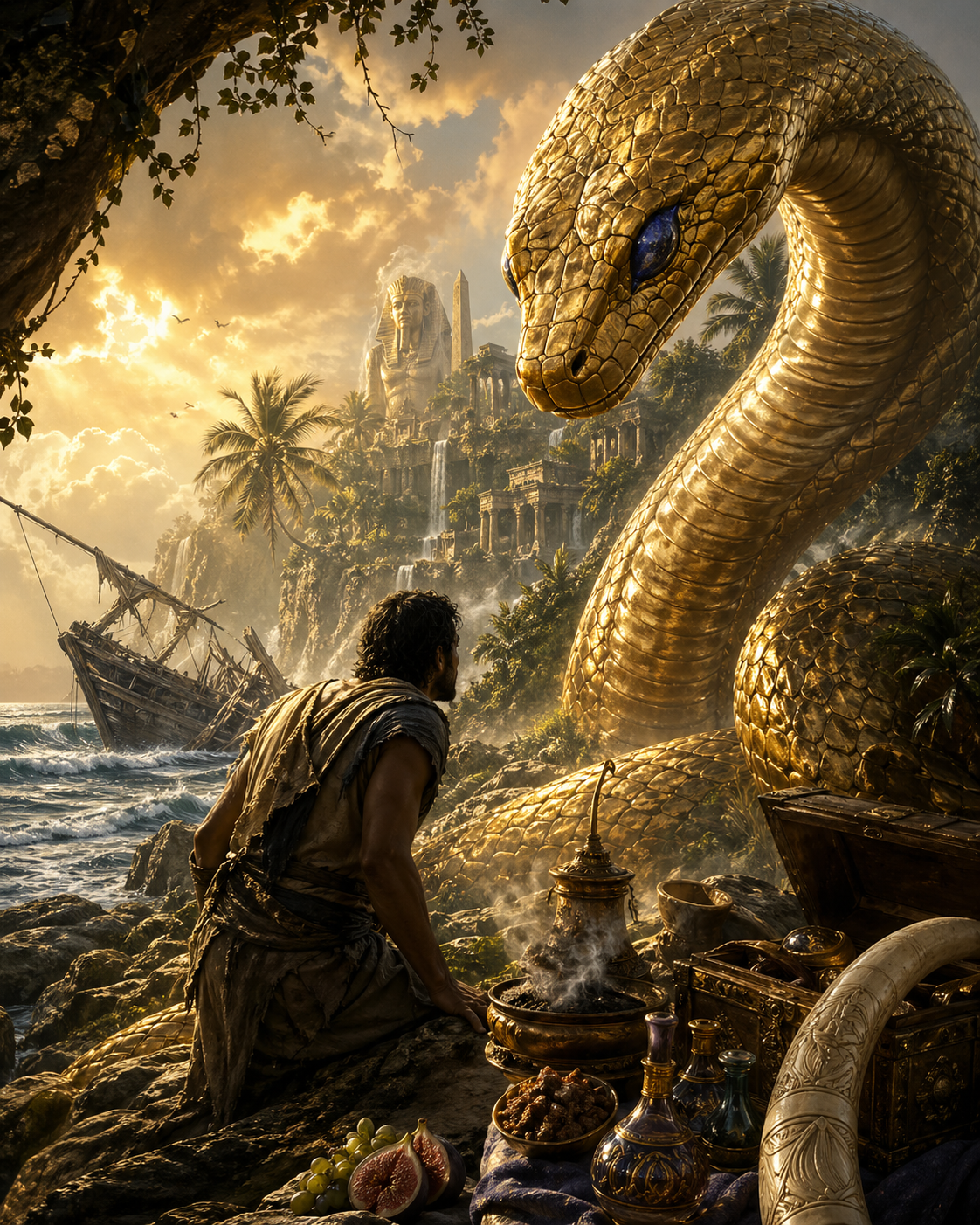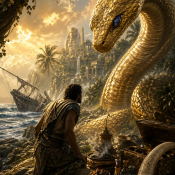While hiding in the brush, the sailor felt the earth tremble. From the shadows emerged a creature of terrifying beauty: a Giant Serpent, thirty cubits long, with a body overlaid with pure gold and eyes made of genuine Lapis Lazuli.